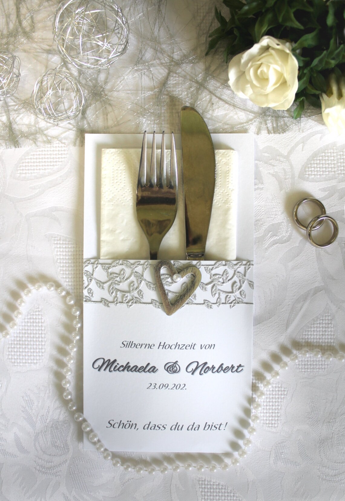 Schick und einzigartig zugleich! Unsere Bestecktaschen sind ein echter Blickfang auf jedem festlich gedeckten Tisch. Sie verbinden praktische Funktion mit stilvollem Design und eignen sich hervorragend für Ihre Silberne Hochzeit. Mit Liebe zum Detail werden unser Bestecktaschen gefertigt und schaffen eine einladende Atmosphäre für Ihre Gäste.