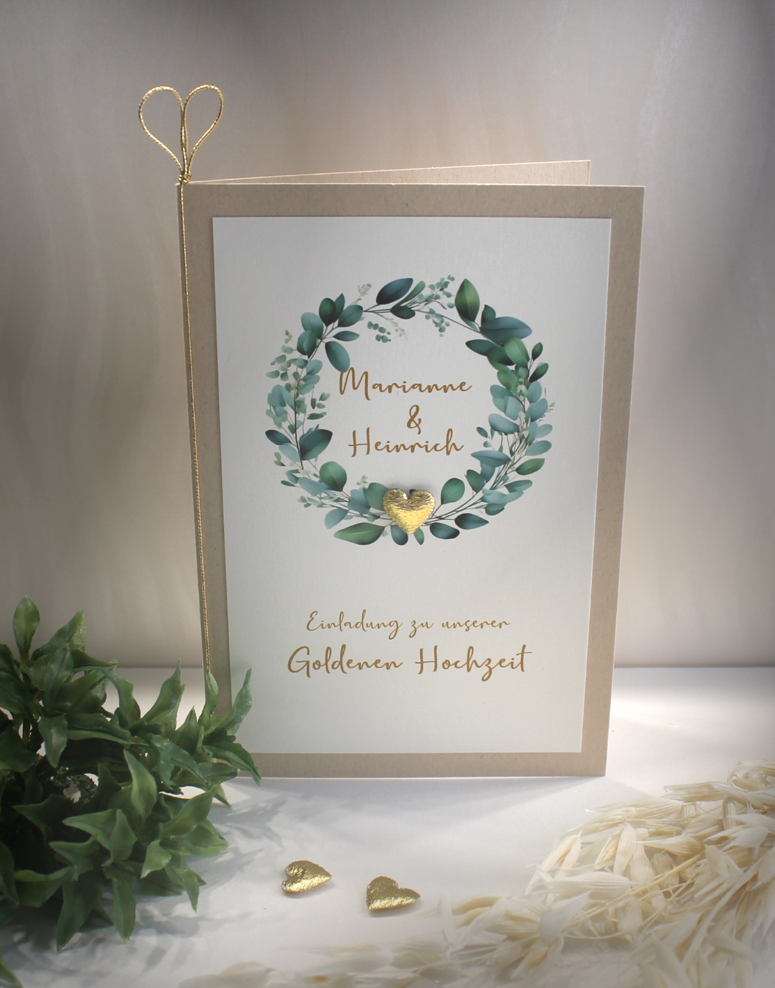 Einladung zur Goldenen Hochzeit "Eukalyptus mit Herz" incl. Personalisierung, Umschlag Design 7119Einladung zur Goldenen Hochzeit „Eukalyptus mit Herz“ incl. Personalisierung, Umschlag Design 7119