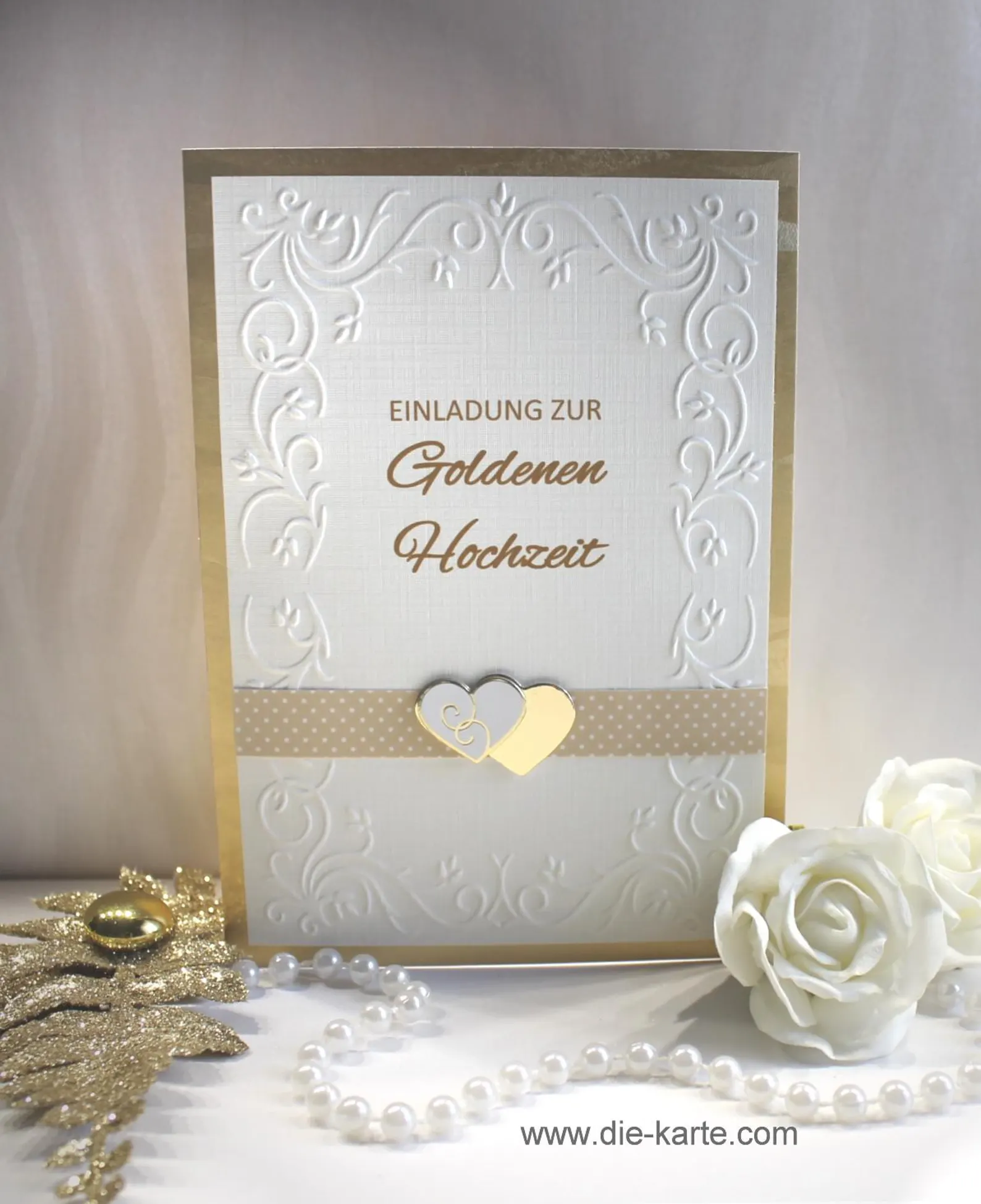 Unsere exklusive Einladungskarte zur Goldenen Hochzeit ist ein echtes Unikat – liebevoll von Hand gefertigt aus hochwertigen Materialien und mit einem Auge fürs Detail gestaltet.