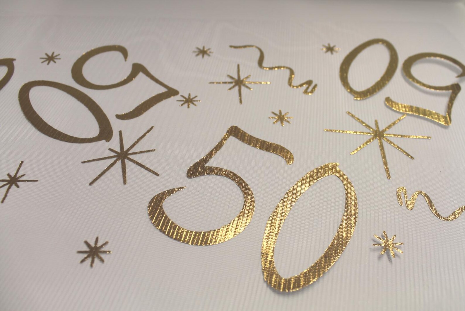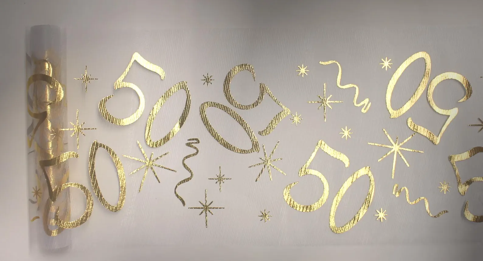Feiern Sie 50 Jahre Liebe und gemeinsame Erinnerungen mit Stil! Unser Dekostoff mit goldenen „50“-Motiven verleiht jeder Festtafel einen Hauch von Eleganz und Glanz – perfekt für Ihre Goldene Hochzeit.
