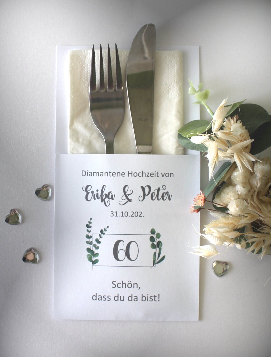 Schick und einzigartig zugleich! Unsere Bestecktaschen sind ein echter Blickfang auf jedem festlich gedeckten Tisch. Sie verbinden praktische Funktion mit stilvollem Design und eignen sich hervorragend für Ihre Diamant Hochzeit. Mit Liebe zum Detail werden unser Bestecktaschen gefertigt und schaffen eine einladende Atmosphäre für Ihre Gäste.