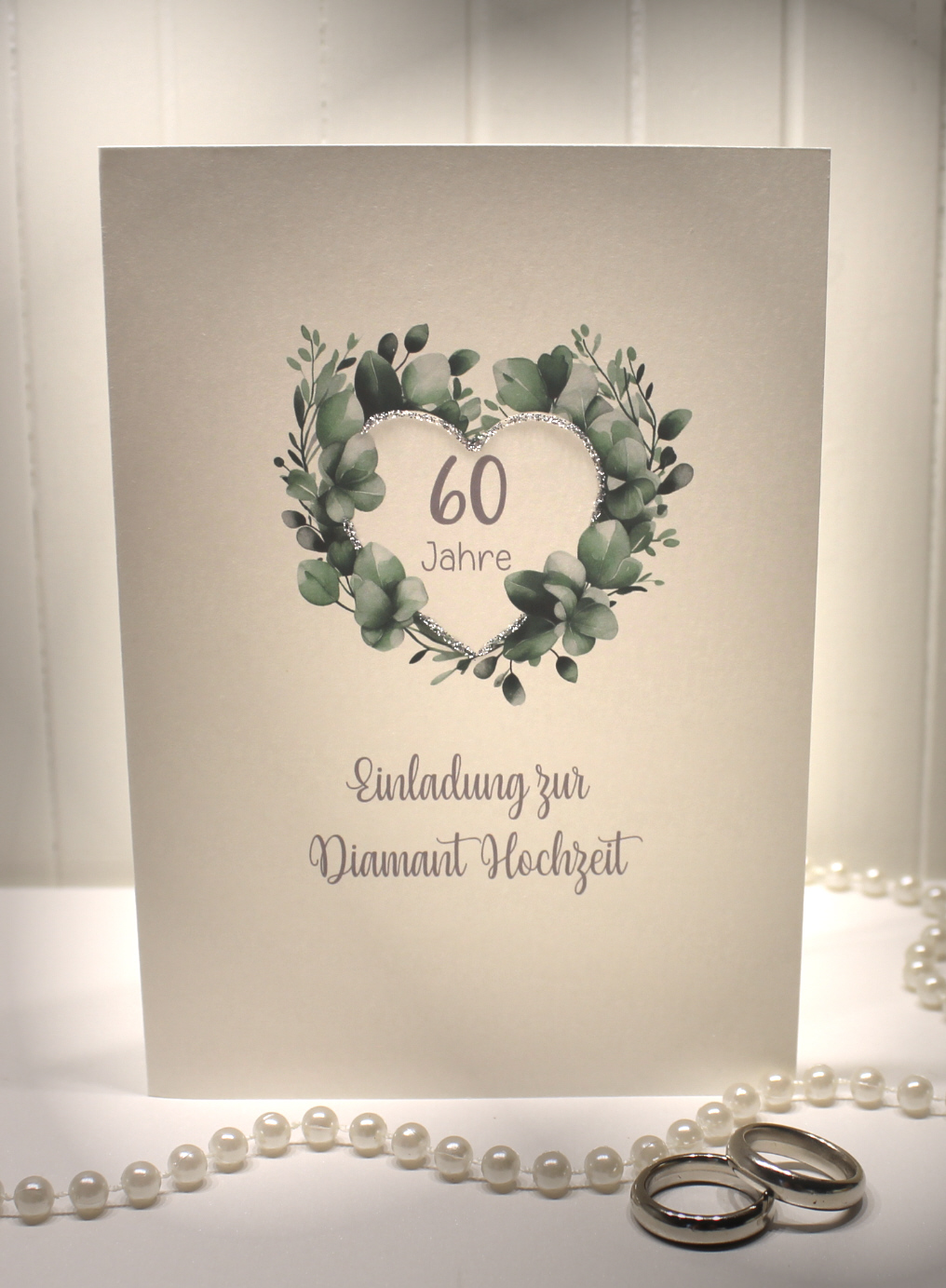 Einladungskarte "Eukalyptusherz" für Ihre Diamantene Hochzeit, incl. Umschlag zum kleinen Preis Design DI 03Einladungskarte „Eukalyptusherz“ für Ihre Diamantene Hochzeit, incl. Umschlag zum kleinen Preis Design DI 03