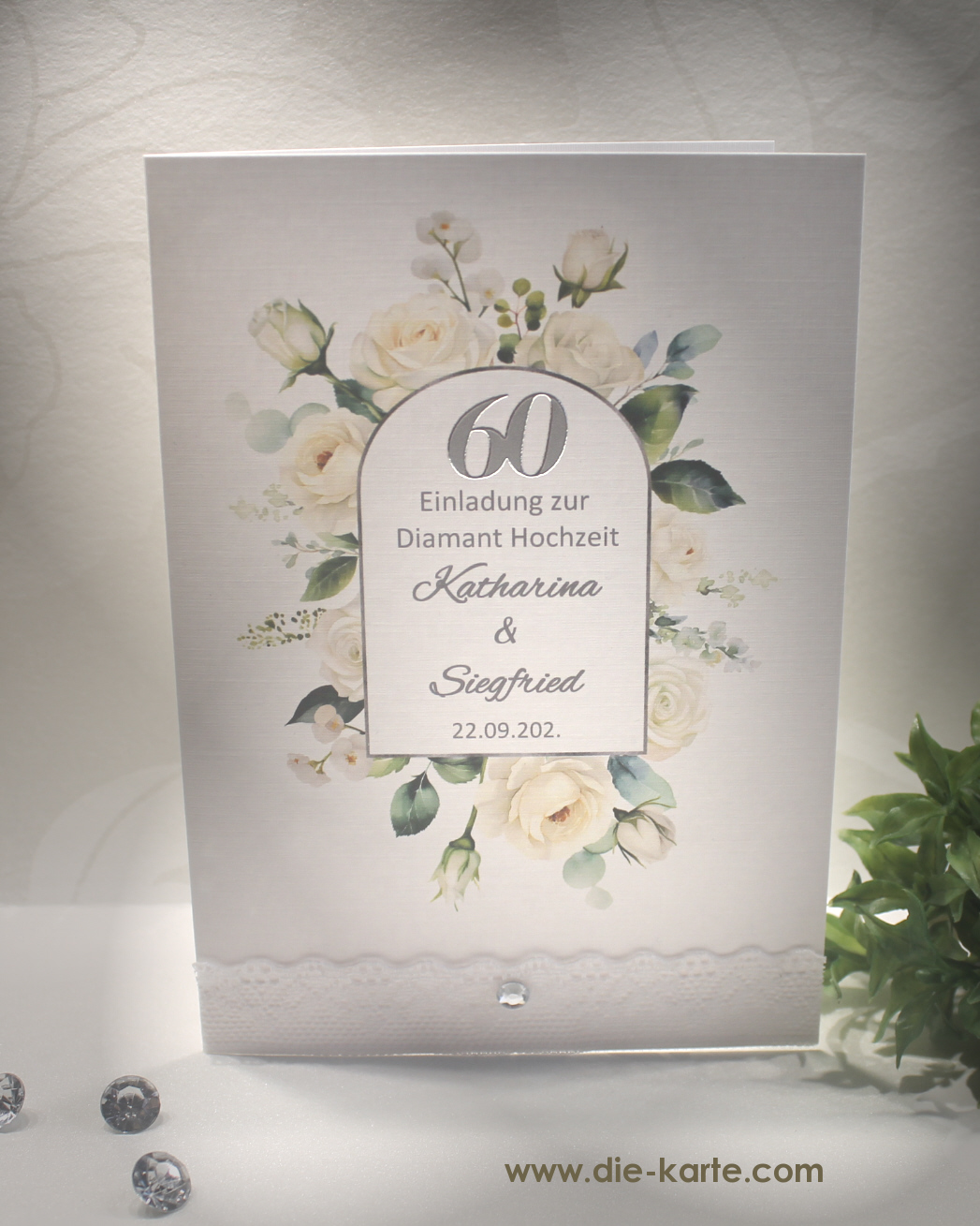 Unsere Einladungskarten für die 60-jährige Hochzeit überzeugen durch hochwertige Qualität, geschmackvolles Design und einen attraktiven Preis – ideal, um Ihre Gäste mit Stil zu Ihrer Feier einzuladen.