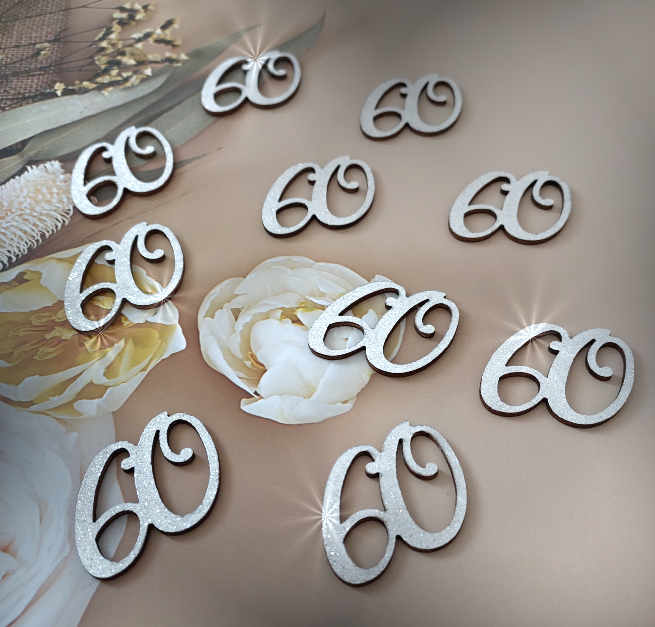 Feiere den besonderen Anlass mit Stil! Diese edle Holzzahl „60“ ist mit funkelndem Silber-Glitzer veredelt und sorgt für einen glänzenden Blickfang bei jeder Feier – ob zum 60. Geburtstag, Jubiläum oder Hochzeitstag.