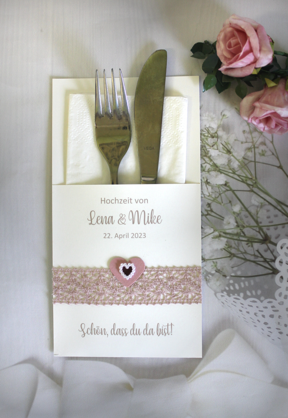 Bestecktasche für Ihre Hochzeit aus einem ivoire Karton in 220g