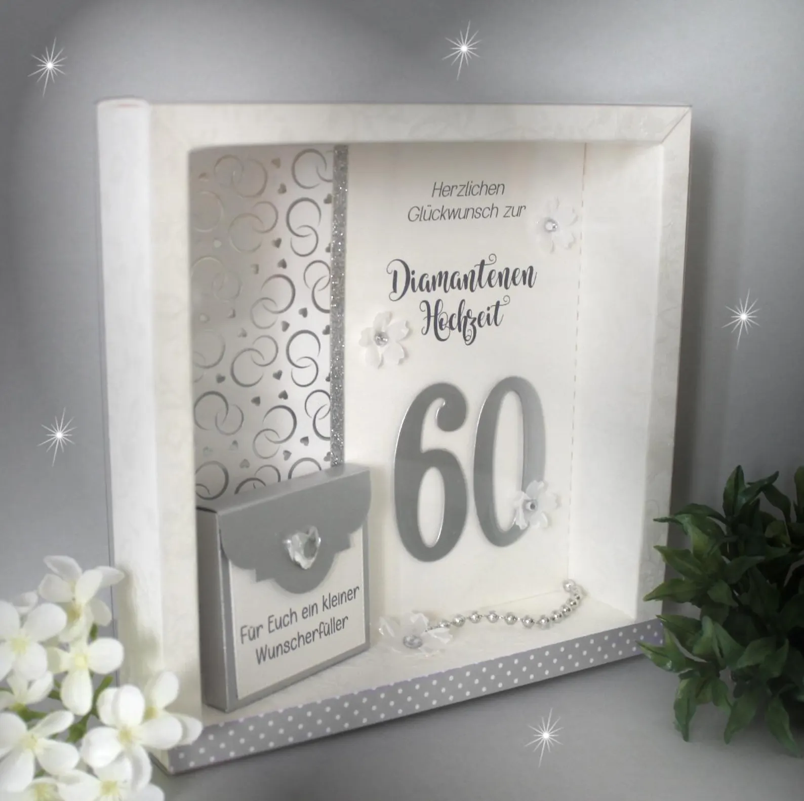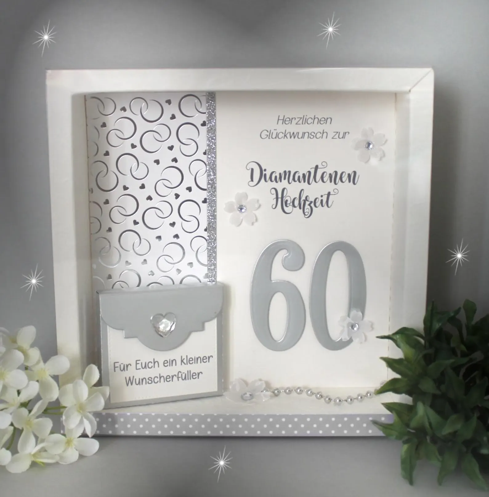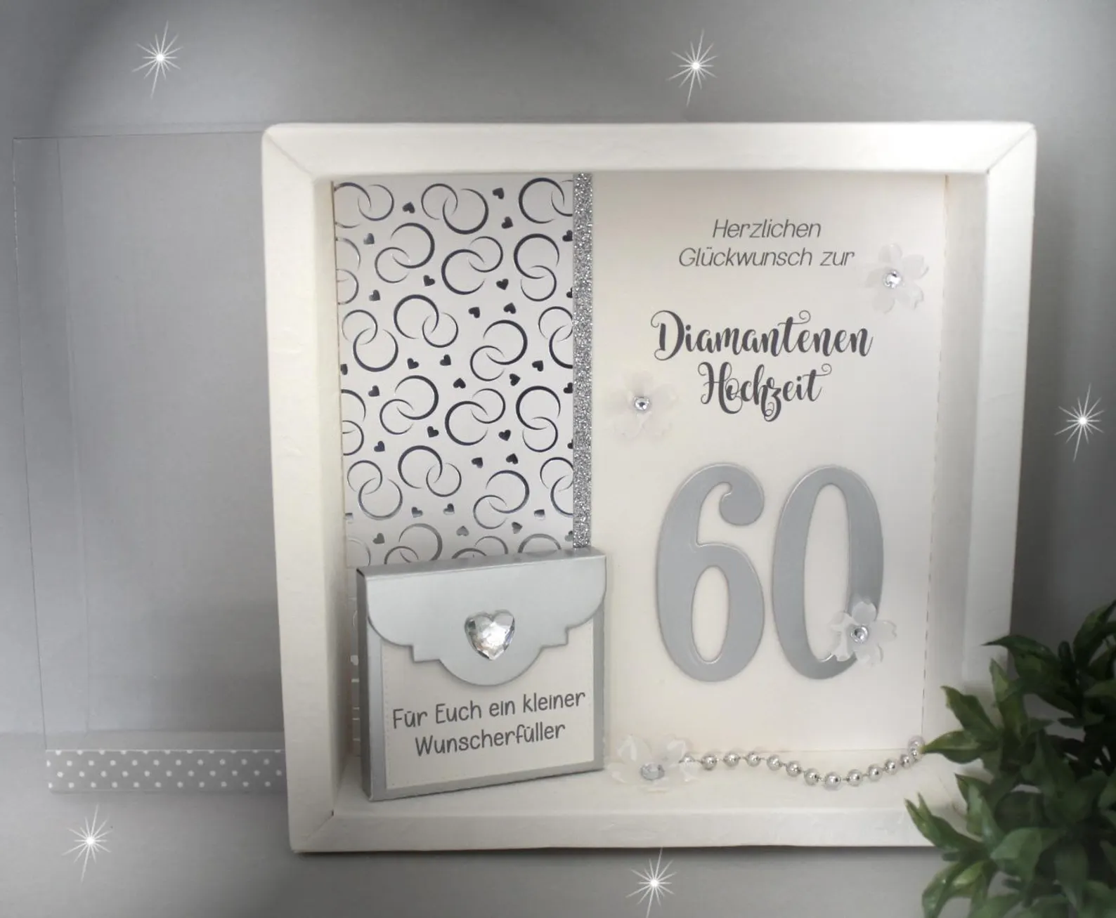 Verleihe deinem Hochzeitsgeschenk eine ganz besondere Note mit diesem hochwertigen Geschenkrahmen mit Klarsichtdeckel. Durch sein edles Design und die liebevolle Dekoration wird jedes Präsent zu einem echten Blickfang. Der Deckel lässt sich ganz einfach zur Seite schieben, um dein Geschenk stilvoll einzulegen. So entsteht eine elegante Verpackung, die das Brautpaar später als dekoratives Erinnerungsstück aufstellen kann. Jeder Rahmen wird mit viel Liebe handdekoriert und individuell mit den Namen des Brautpaares gestaltet. So entsteht ein einzigartiges Unikat, das den besonderen Tag unvergesslich macht.
