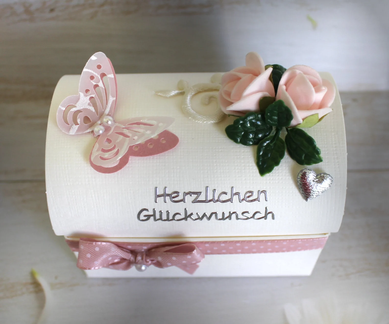 Verleihen Sie Ihrem Geschenk einen besonderen Rahmen! Diese elegante Geschenketruhe aus hochwertigem Karton ist die ideale Wahl für eien Geburtstag und eignet sich besonders für Geldgeschenke oder kleine Überraschungen. Die Truhe ist sorgfältig verarbeitet und mit feinen Materialien verziert, die ihr eine edle und festliche Optik verleihen.