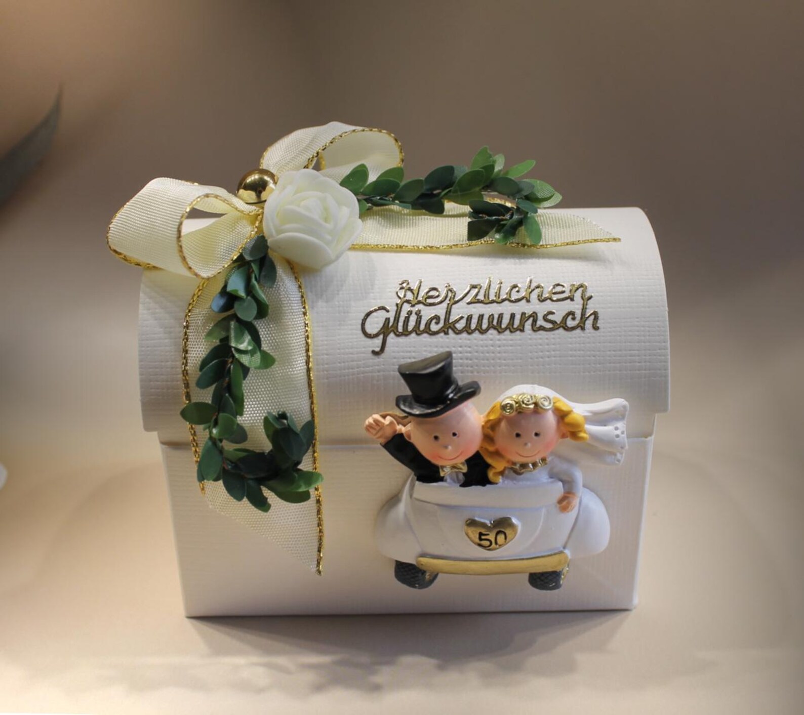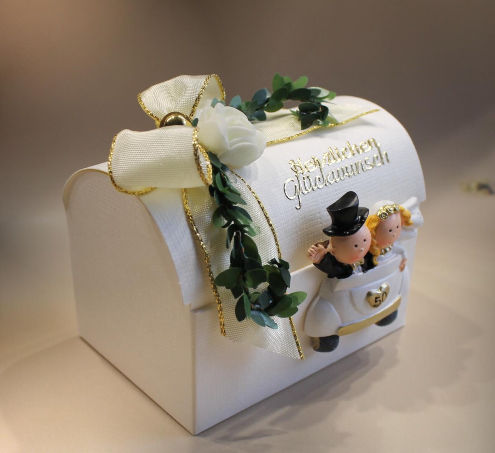 Verleihen Sie Ihrem Geschenk einen besonderen Rahmen! Diese elegante Geschenketruhe aus hochwertigem Karton ist die ideale Wahl für Goldene Hochzeiten und eignet sich besonders für Geldgeschenke oder kleine Überraschungen. Die Truhe ist sorgfältig verarbeitet und mit feinen Materialien verziert, die ihr eine edle und festliche Optik verleihen.