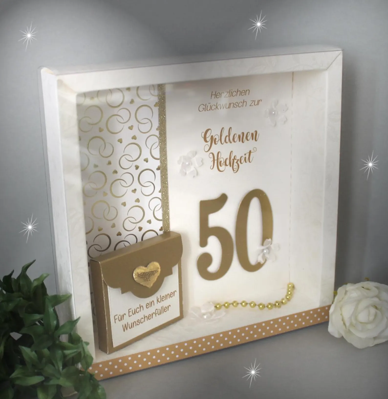 Verleihe deinem Hochzeitsgeschenk eine ganz besondere Note mit diesem hochwertigen Geschenkrahmen mit Klarsichtdeckel. Durch sein edles Design und die liebevolle Dekoration wird jedes Präsent zu einem echten Blickfang. Der Deckel lässt sich ganz einfach zur Seite schieben, um dein Geschenk stilvoll einzulegen. So entsteht eine elegante Verpackung, die das Brautpaar später als dekoratives Erinnerungsstück aufstellen kann. Jeder Rahmen wird mit viel Liebe handdekoriert und individuell mit den Namen des Brautpaares gestaltet. So entsteht ein einzigartiges Unikat, das den besonderen Tag unvergesslich macht.