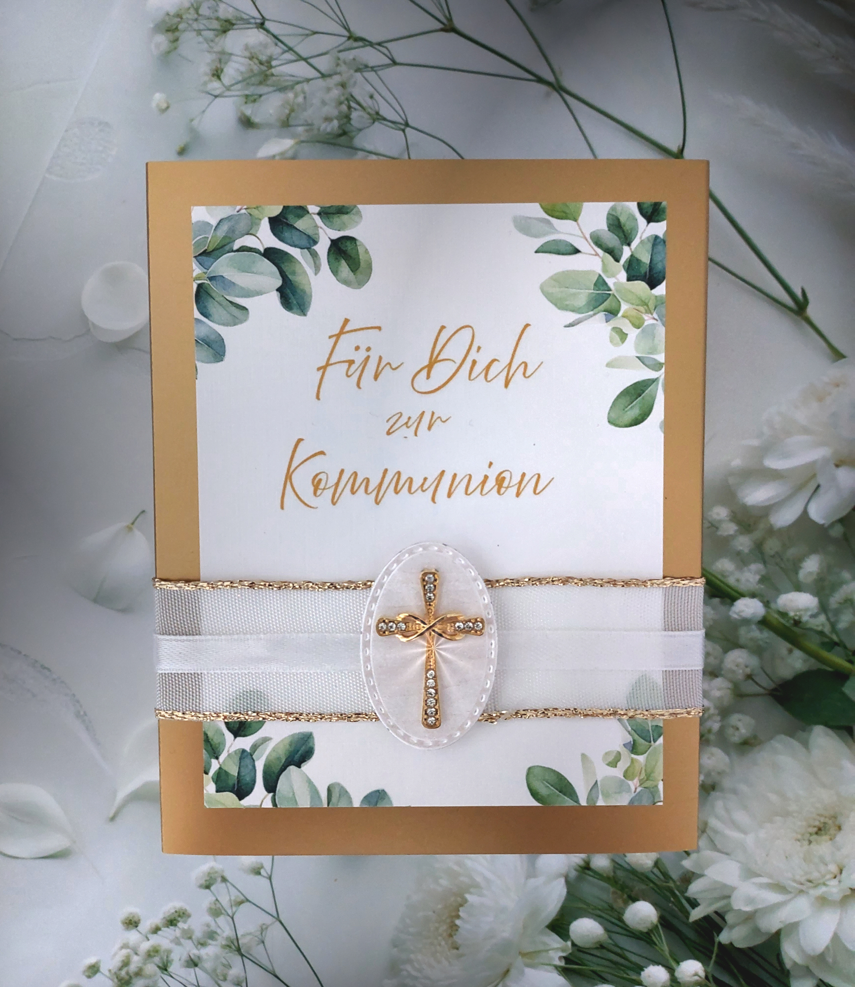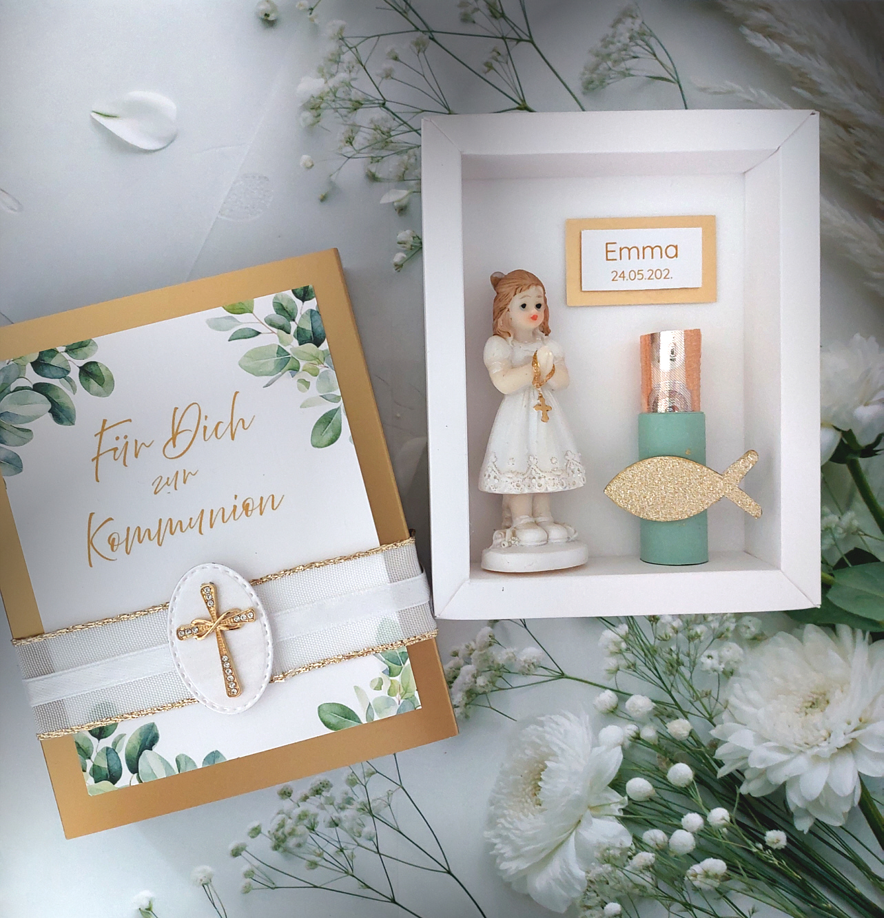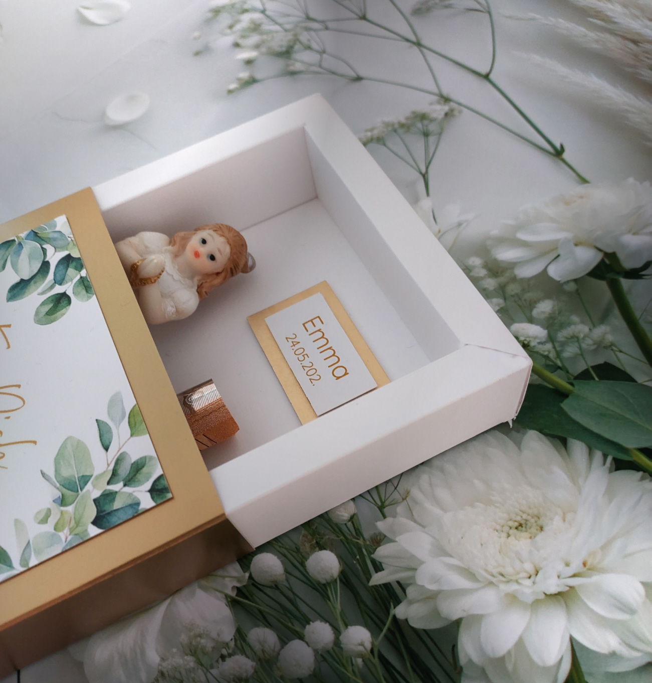 Die Kombination aus edlen weiss- und goldtönen verleiht der Schachtel eine moderne und zugleich festliche Ausstrahlung. Im Inneren befindet sich eine liebevoll gestaltete Mädchenfigur, die das Thema Kommunion stilvoll aufgreift und die Schachtel zu einem echten Blickfang macht.