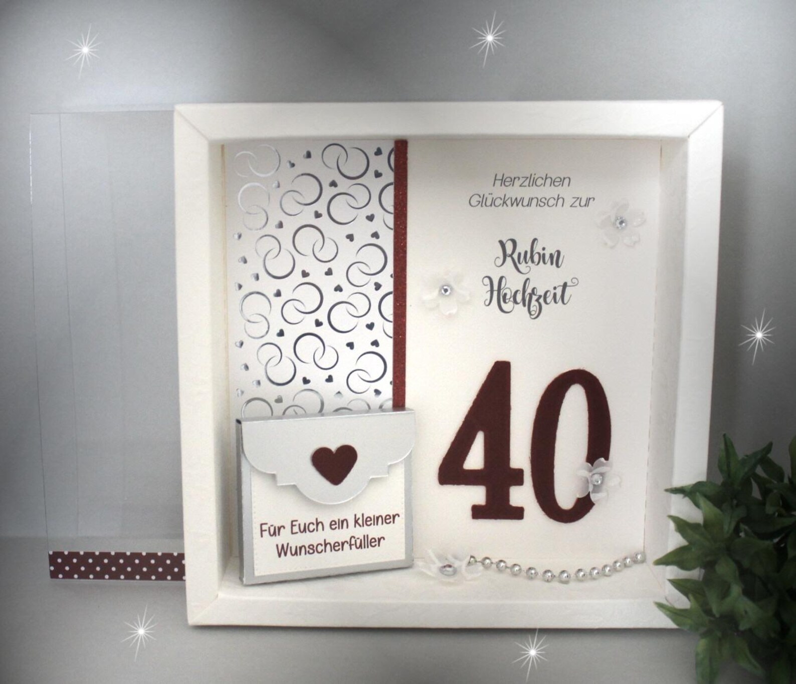 Verleihe deinem Hochzeitsgeschenk eine ganz besondere Note mit diesem hochwertigen Geschenkrahmen mit Klarsichtdeckel. Durch sein edles Design und die liebevolle Dekoration wird jedes Präsent zu einem echten Blickfang. Der Deckel lässt sich ganz einfach zur Seite schieben, um dein Geschenk stilvoll einzulegen. So entsteht eine elegante Verpackung, die das Brautpaar später als dekoratives Erinnerungsstück aufstellen kann. Jeder Rahmen wird mit viel Liebe handdekoriert und individuell mit den Namen des Brautpaares gestaltet. So entsteht ein einzigartiges Unikat, das den besonderen Tag unvergesslich macht.