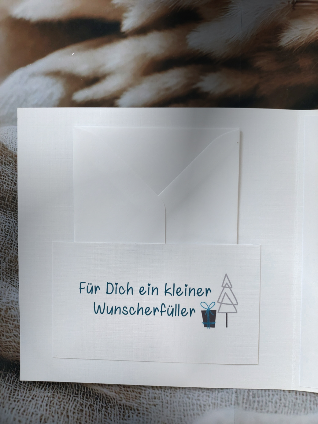 Handgemachte Weihnachtskarte mit Umschlag auf Wunsch auch als Geldgeschenk. Diese liebevoll handgemachte Weihnachtskarte ist mehr als nur ein Gruß – sie ist eine kleine Aufmerksamkeit mit Herz! Jede Karte wird mit viel Sorgfalt gestaltet und enthält auf Wunsch einen kleinen Umschlag im Inneren, perfekt für ein Geldgeschenk. So wird Ihr Weihnachtsgruß zu einem persönlichen Highlight unter dem Weihnachtsbaum.