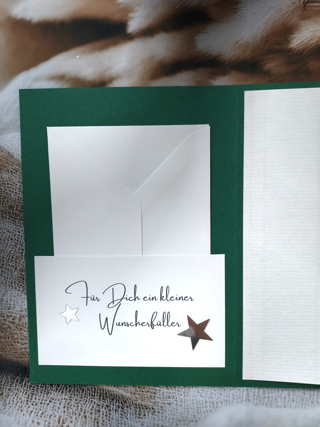 Handgemachte Weihnachtskarte mit Umschlag auf Wunsch auch als Geldgeschenk. Diese liebevoll handgemachte Weihnachtskarte ist mehr als nur ein Gruß – sie ist eine kleine Aufmerksamkeit mit Herz! Jede Karte wird mit viel Sorgfalt gestaltet und enthält auf Wunsch einen kleinen Umschlag im Inneren, perfekt für ein Geldgeschenk. So wird Ihr Weihnachtsgruß zu einem persönlichen Highlight unter dem Weihnachtsbaum.