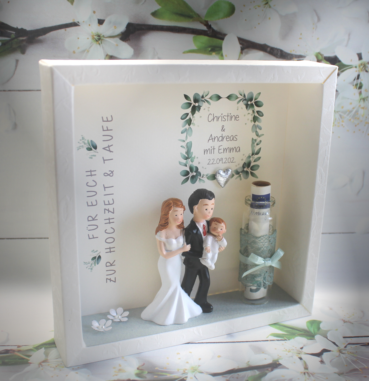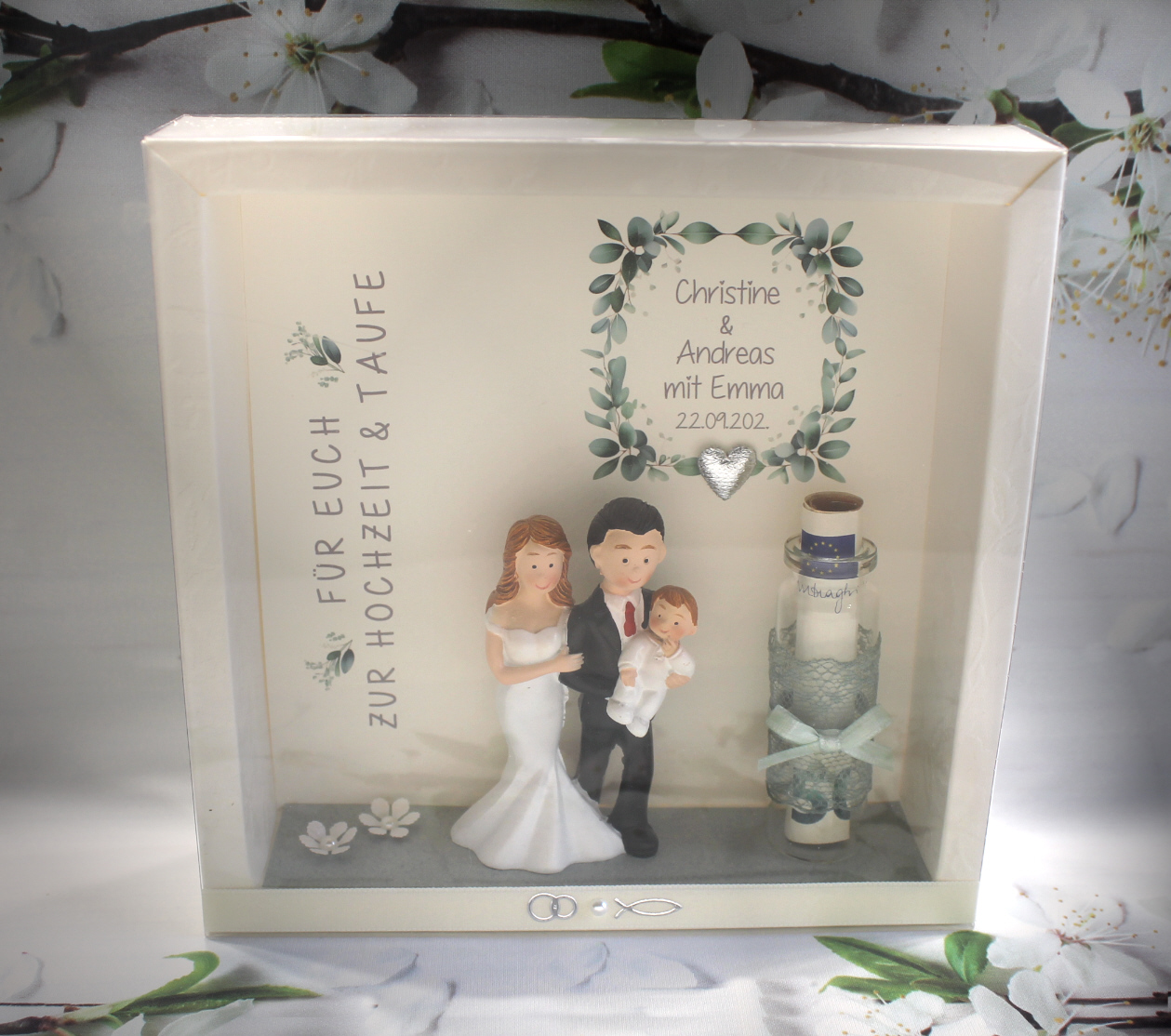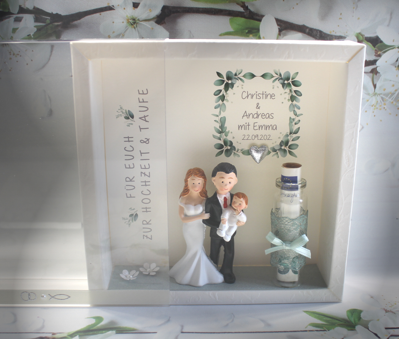 Verleihe deinem Hochzeitsgeschenk eine ganz besondere Note mit diesem hochwertigen Geschenkrahmen mit Klarsichtdeckel. Durch sein edles Design und die liebevolle Dekoration wird jedes Präsent zu einem echten Blickfang. Der Deckel lässt sich ganz einfach zur Seite schieben, um dein Geschenk stilvoll einzulegen. So entsteht eine elegante Verpackung, die das Brautpaar später als dekoratives Erinnerungsstück aufstellen kann. Jeder Rahmen wird mit viel Liebe handdekoriert und individuell mit den Namen des Brautpaares sowie dem Hochzeitsdatum gestaltet. So entsteht ein einzigartiges Unikat, das den besonderen Tag unvergesslich macht.