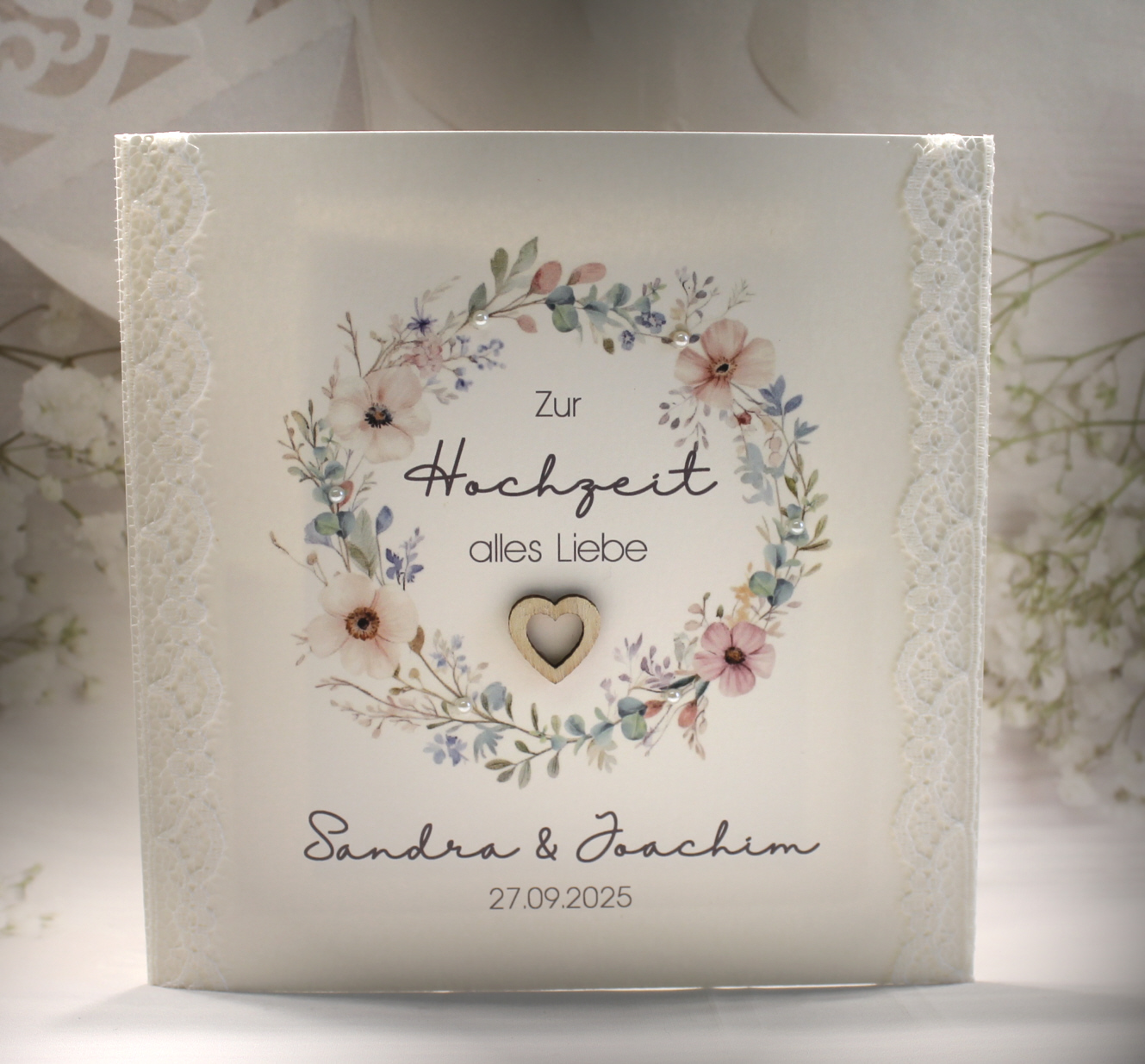 Glückwunschkarte zur Hochzeit "Blütenkranz" mit echter Spitze, incl. Personalisierung und auf Wunsch als Geldgeschenk Design 124Glückwunschkarte zur Hochzeit „Blütenkranz“ mit echter Spitze, incl. Personalisierung und auf Wunsch als Geldgeschenk Design 124