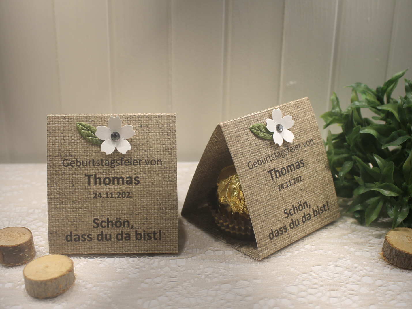 bedruckt mit ihrem Anlass, Namen sowie dem Festdatum.