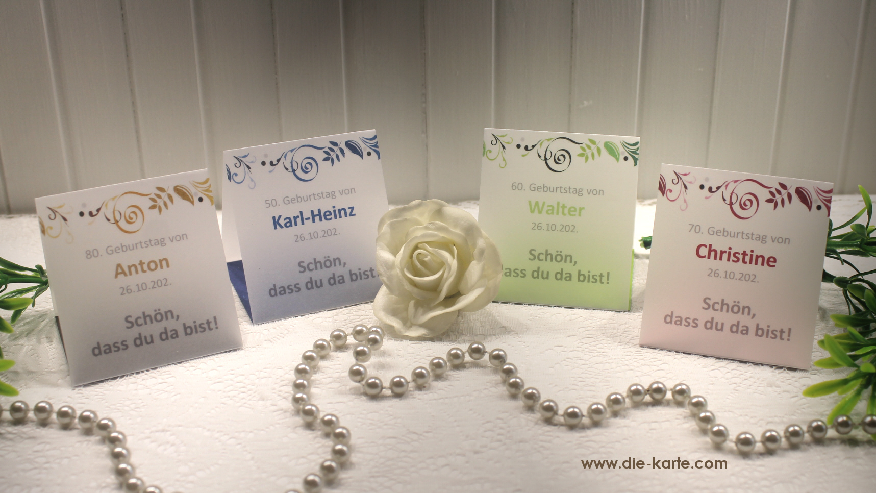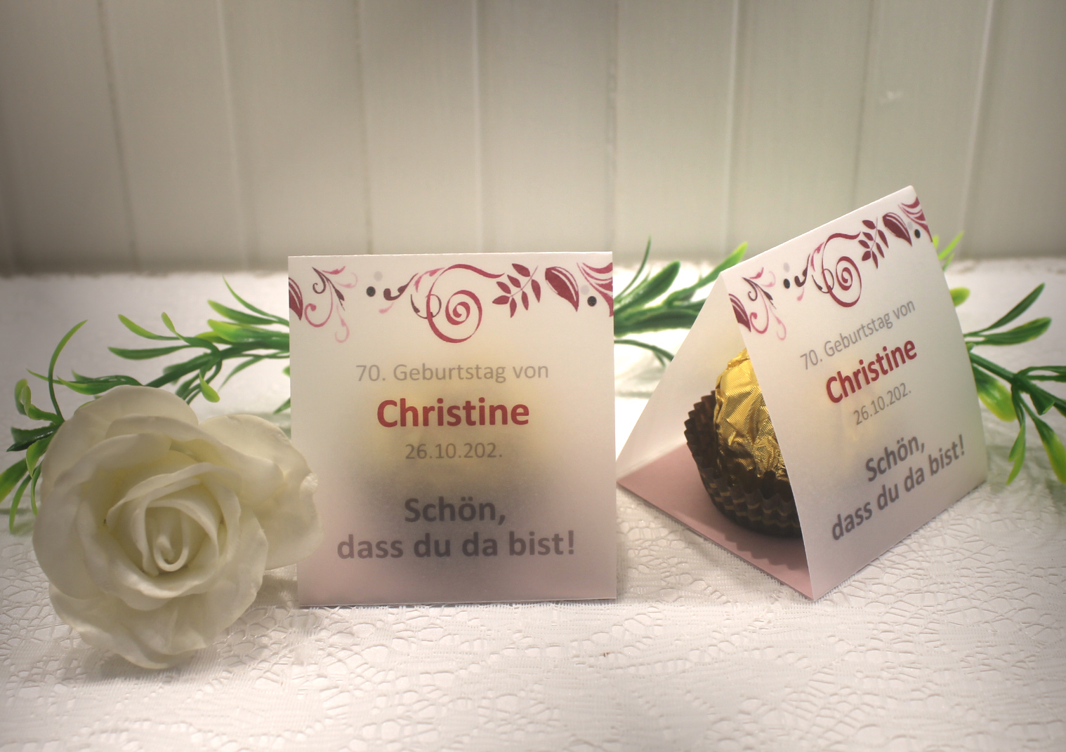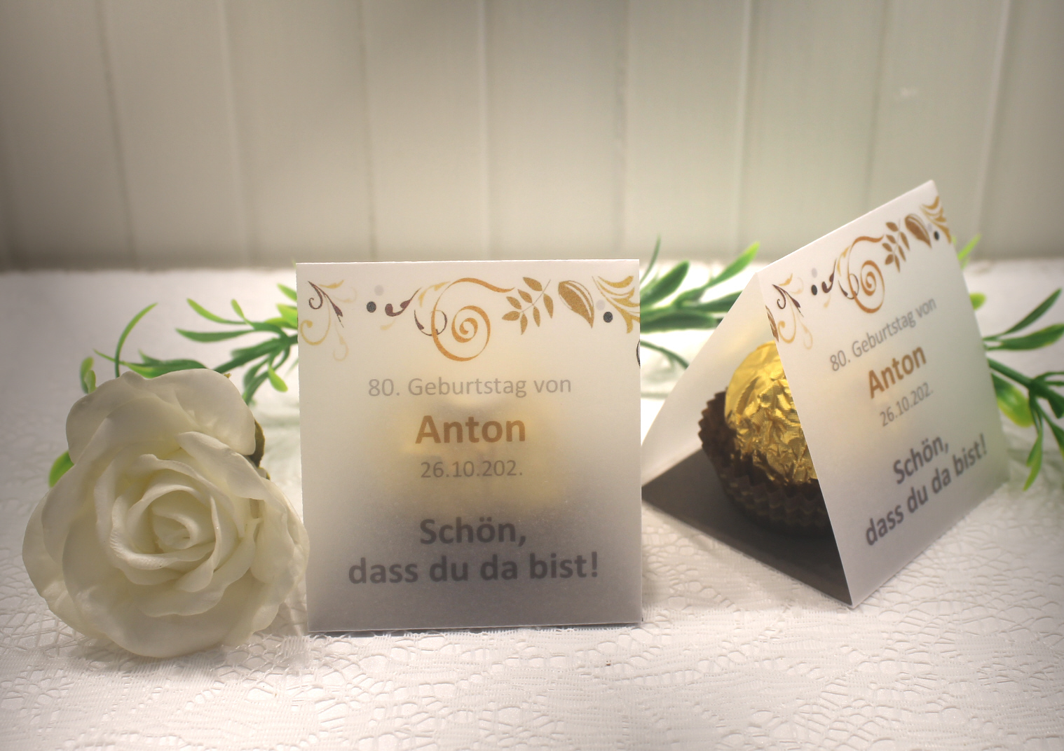 bedruckt mit ihrem Anlass, Namen sowie dem Festdatum.