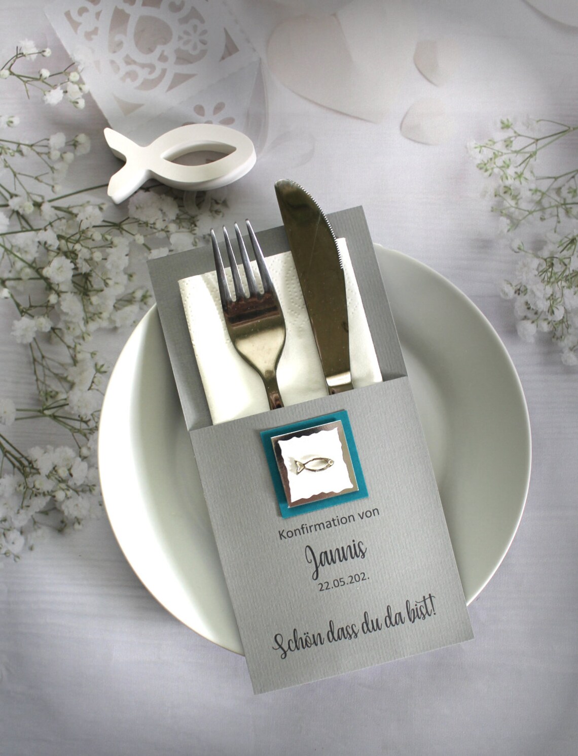 Unsere Bestecktaschen sind nicht nur ein elegantes Detail, sondern ein echter Blickfang auf jedem festlich gedeckten Tisch. Sie verbinden Stil und Funktionalität auf charmante Weise – ideal als Tischdekoration und zugleich als persönliches Highlight für Ihre Gäste. Jede Bestecktasche wird mit Liebe zum Detail gefertigt und kann perfekt mit dem Design Ihrer Gastgeschenk-Kerzen kombiniert werden. So entsteht ein harmonisches Gesamtbild auf Ihrer festlichen Tafel.