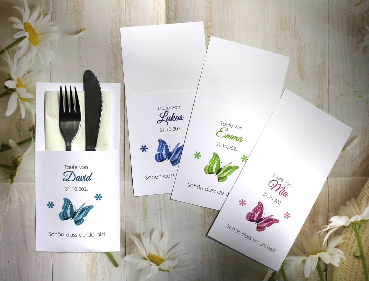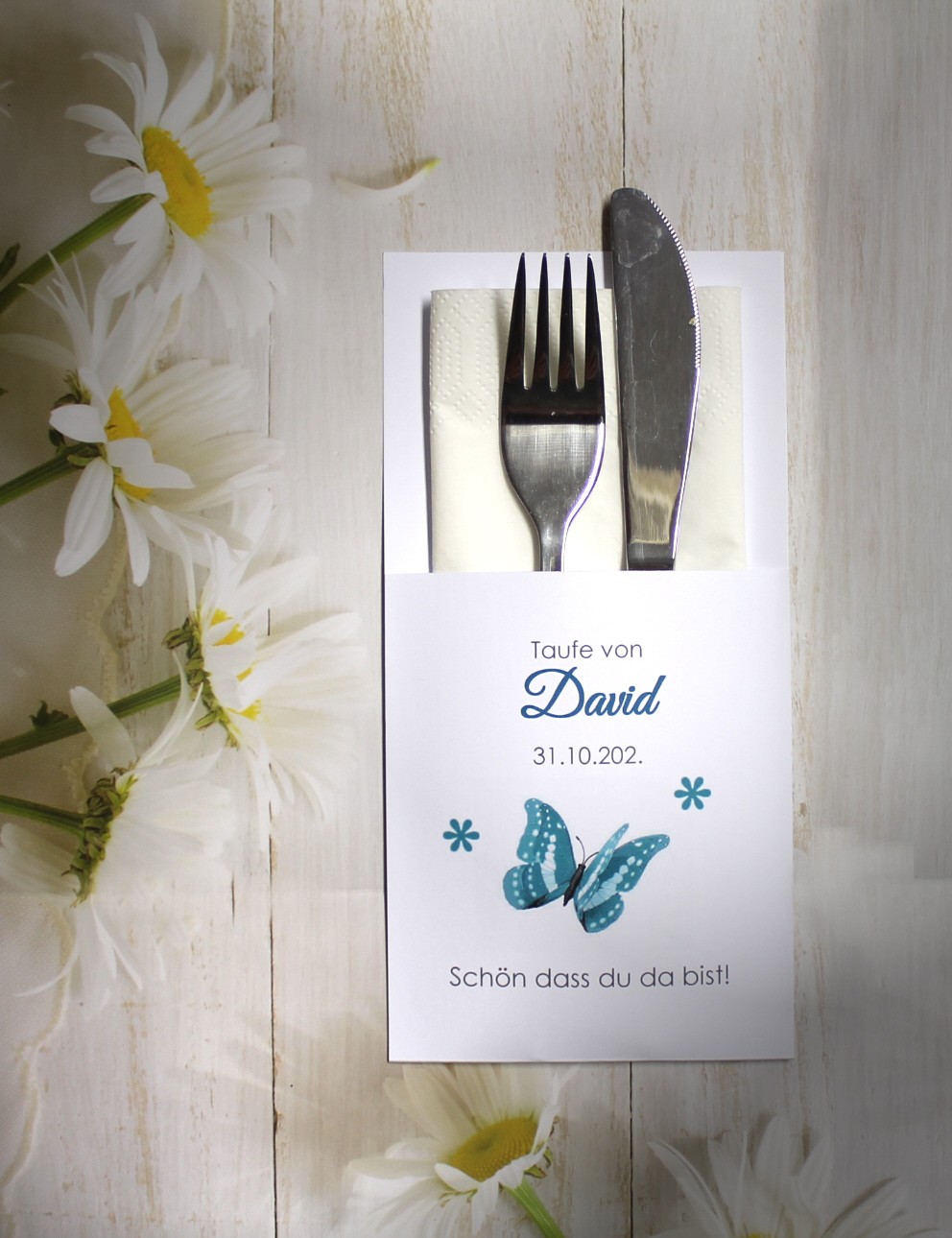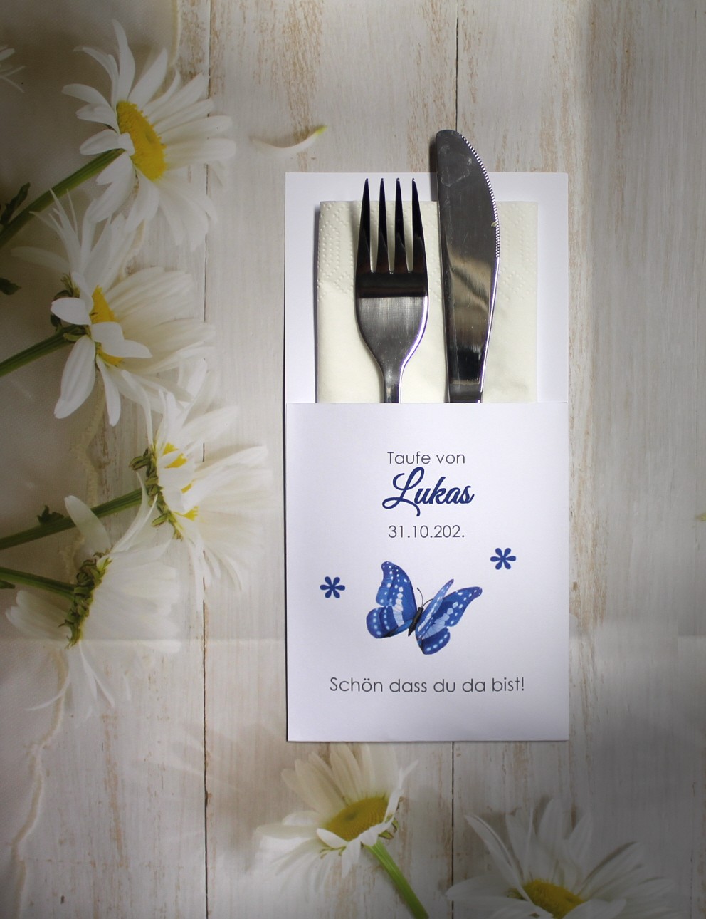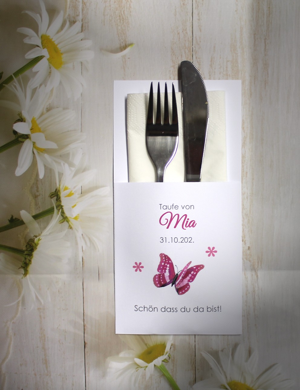 Unsere Bestecktaschen sind nicht nur ein elegantes Detail, sondern ein echter Blickfang auf jedem festlich gedeckten Tisch. Sie verbinden Stil und Funktionalität auf charmante Weise – ideal als Tischdekoration und zugleich als persönliches Highlight für Ihre Gäste. Jede Bestecktasche wird mit Liebe zum Detail gefertigt und kann perfekt mit dem Design Ihrer Gastgeschenk-Kerzen kombiniert werden. So entsteht ein harmonisches Gesamtbild auf Ihrer festlichen Tafel.