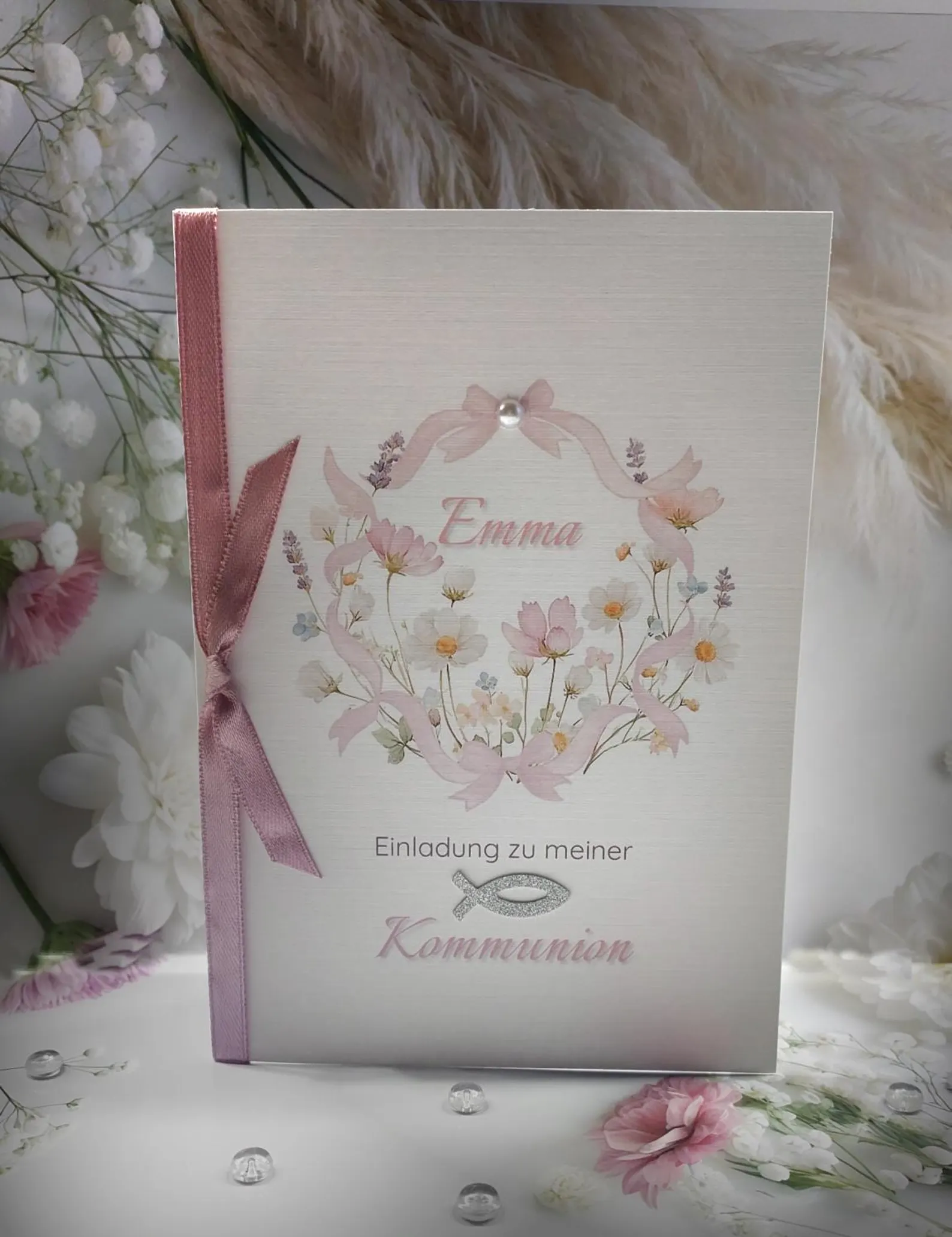 Edle Leinenkarte mit feinem Blütenkranz in zarten Rosatönen. Eine dekorative Schleife und der silberne Fisch setzen stilvolle Akzente und verleihen der Karte eine hochwertige, festliche Note. Ideal als Einladung zur Kommunion oder Konfirmation – zeitlos, elegant und liebevoll gestaltet.