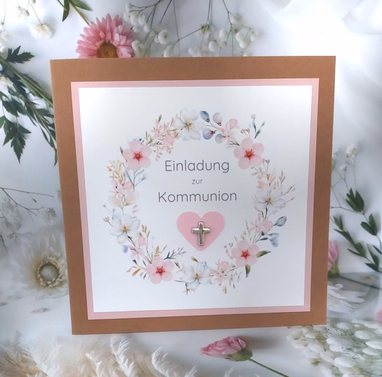 Edle Karte aus Kraftkarton mit zartem Blütenkranz und einem rosa Herz, verziert mit einem kleinen silbernen Kreuz. Die Kombination aus natürlichem Material und feinen Details macht die Karte zu einer stilvollen Einladung für Kommunion oder Konfirmation oder Taufe.