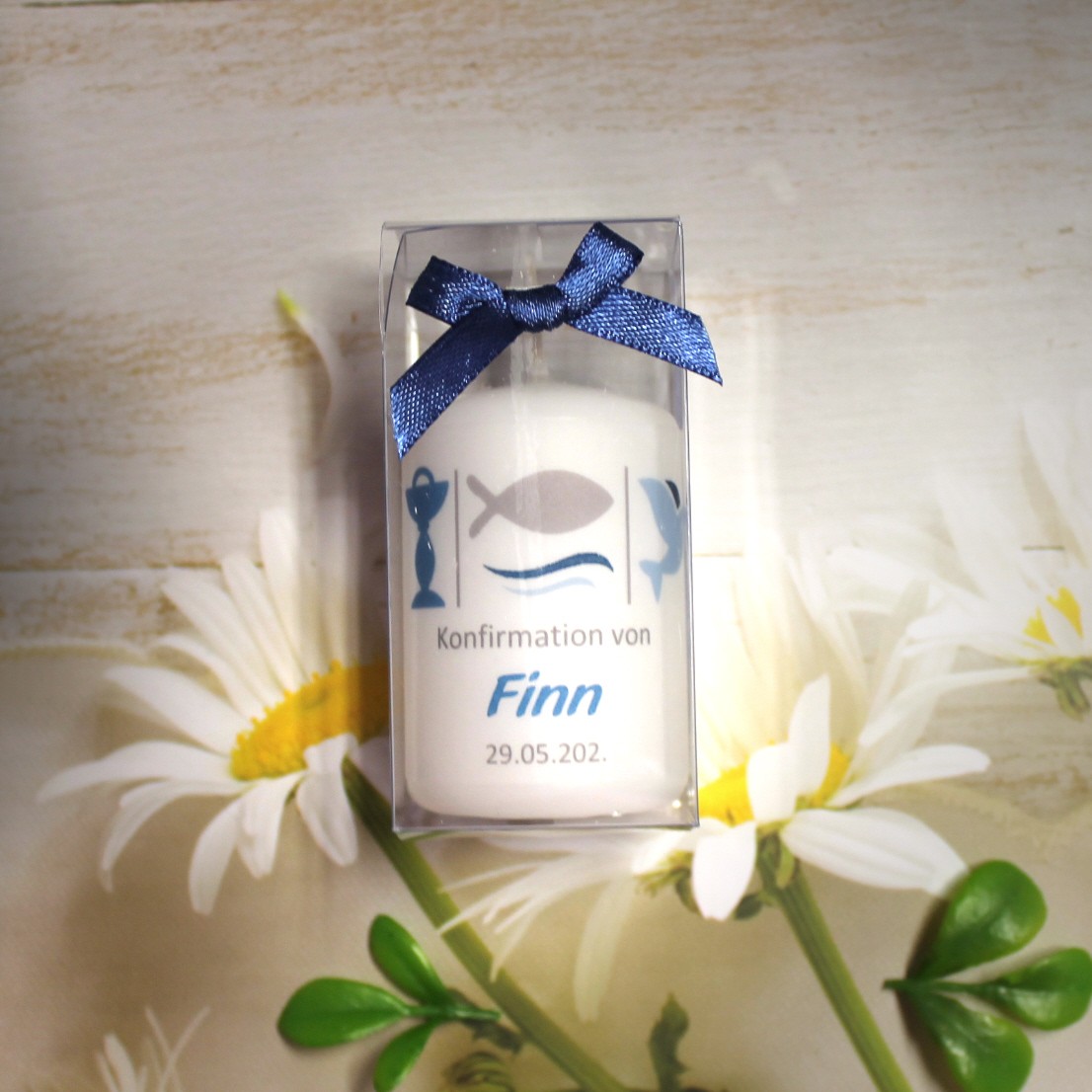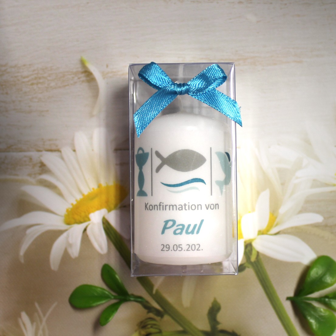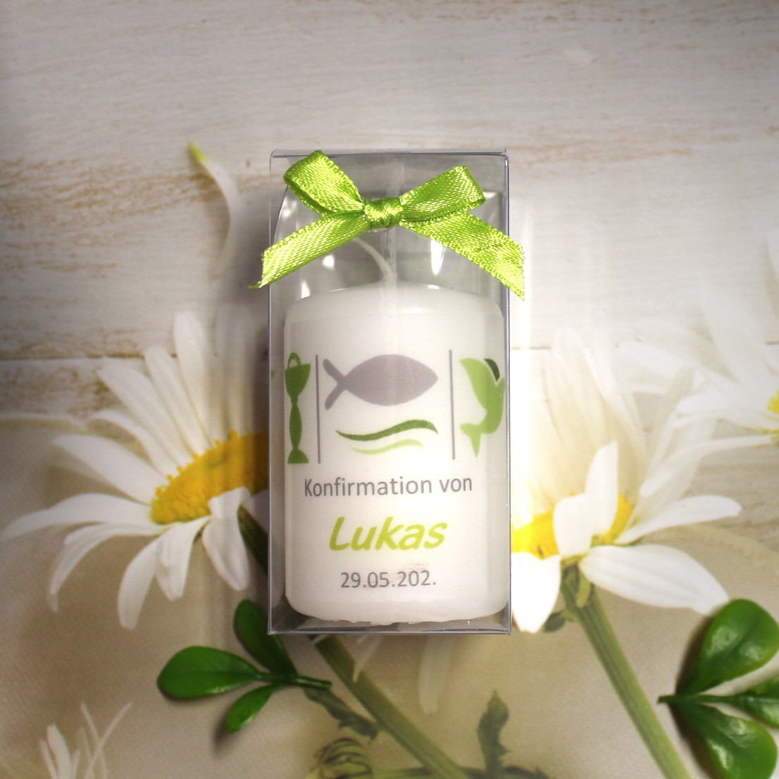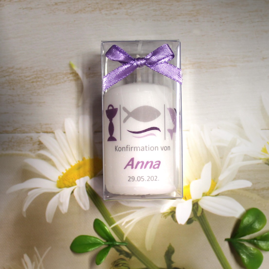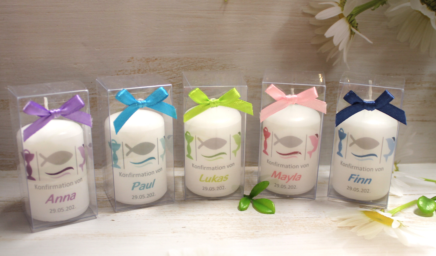 Jede Kerze wird mit einem feinen Pergamentband umlegt, das individuell mit Ihrem Anlass, den Namen und dem Festdatum bedruckt wird.
