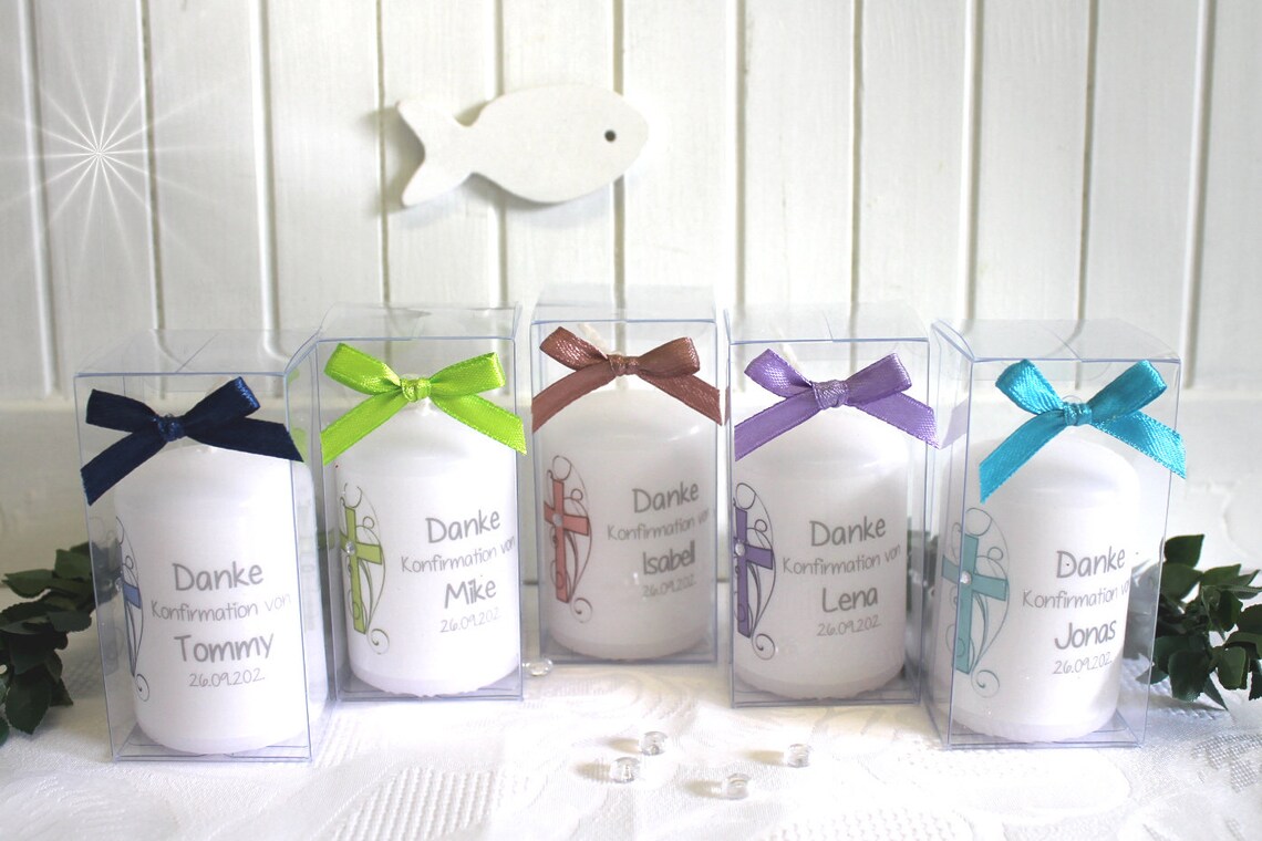 Jede Kerze wird mit einem feinen Pergamentband umlegt, das individuell mit Ihrem Anlass, den Namen und dem Festdatum bedruckt wird.