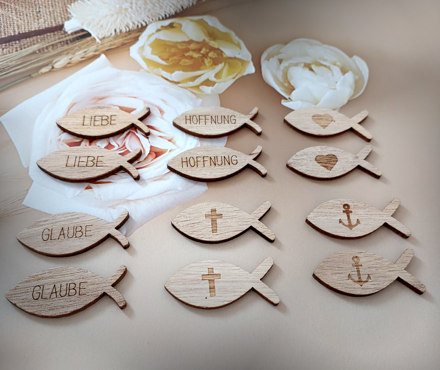 Verleihen Sie Ihren Bastelprojekten und Feierlichkeiten eine besondere Note mit diesen liebevollen Holzfischen. Ob als Streudeko auf dem Tisch, als Anhänger für Geschenke, oder für kreative Bastelideen – die kleinen Fische aus Holz bringen Natürlichkeit und Charme in jede Dekoration. Ideal für Taufen, Kommunionen, Konfirmationen dank ihrer schlichten Eleganz passen sie zu vielen Stilrichtungen.