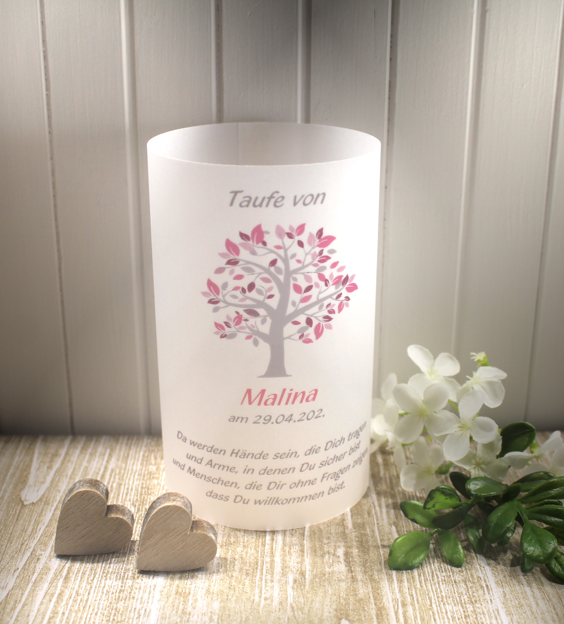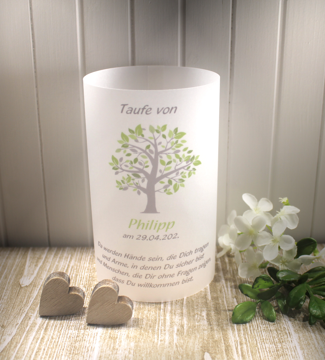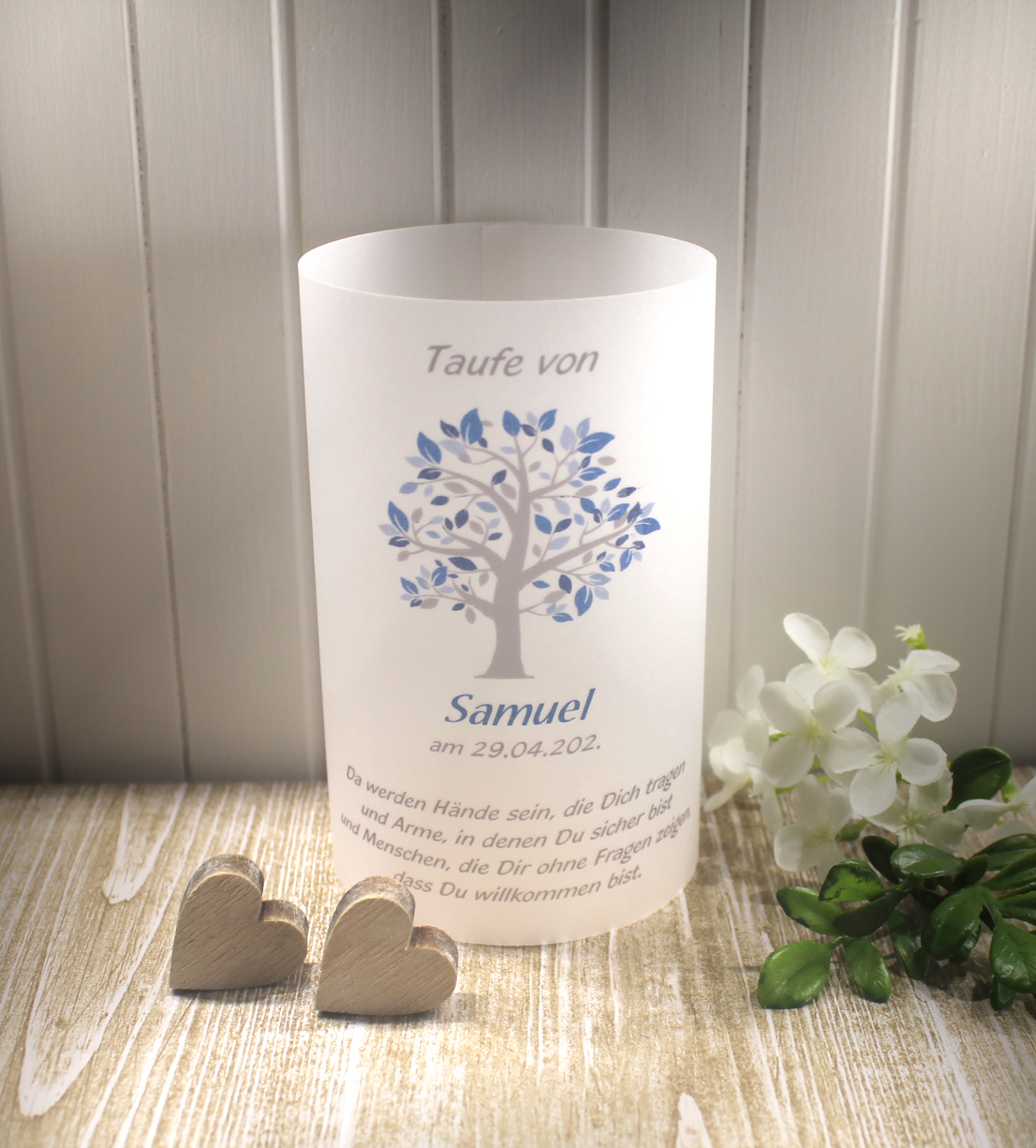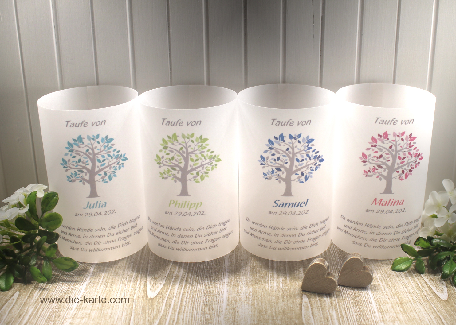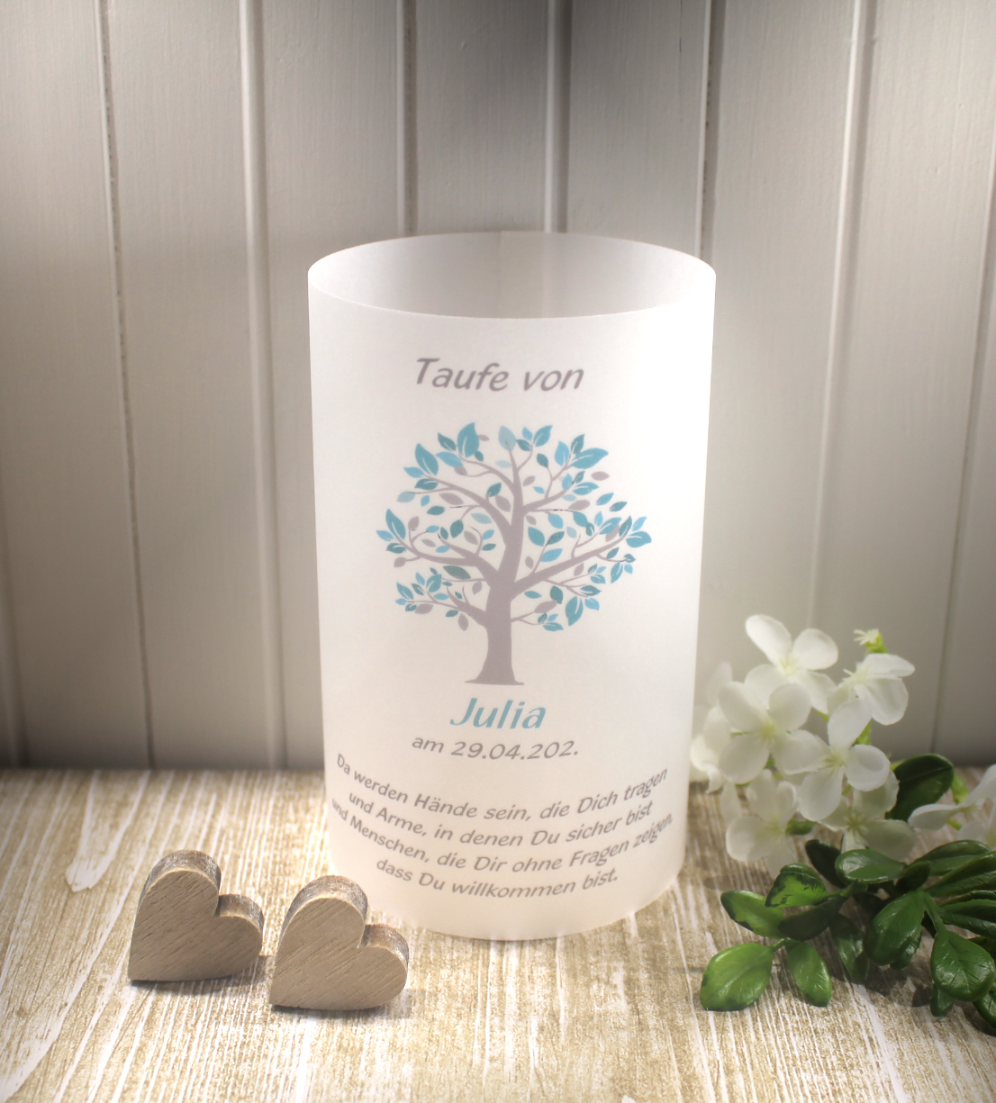 Unsere hochwertigen Windlichter aus feinem Pergament sind ein echter Blickfang auf jeder festlich gedeckten Tafel. Das sanft durchscheinende Material lässt das Kerzenlicht weich leuchten und sorgt für eine stilvolle Atmosphäre – perfekt für Ihre Taufe. Jedes Windlicht überzeugt durch seine schlichte Schönheit und die besondere Lichtwirkung, die jeden Raum in ein warmes, einladendes Ambiente taucht. Ob als einzelnes Highlight oder in Kombination mit anderen Dekorationselementen – diese Pergament-Windlichter verleihen jedem Anlass das gewisse Etwas.