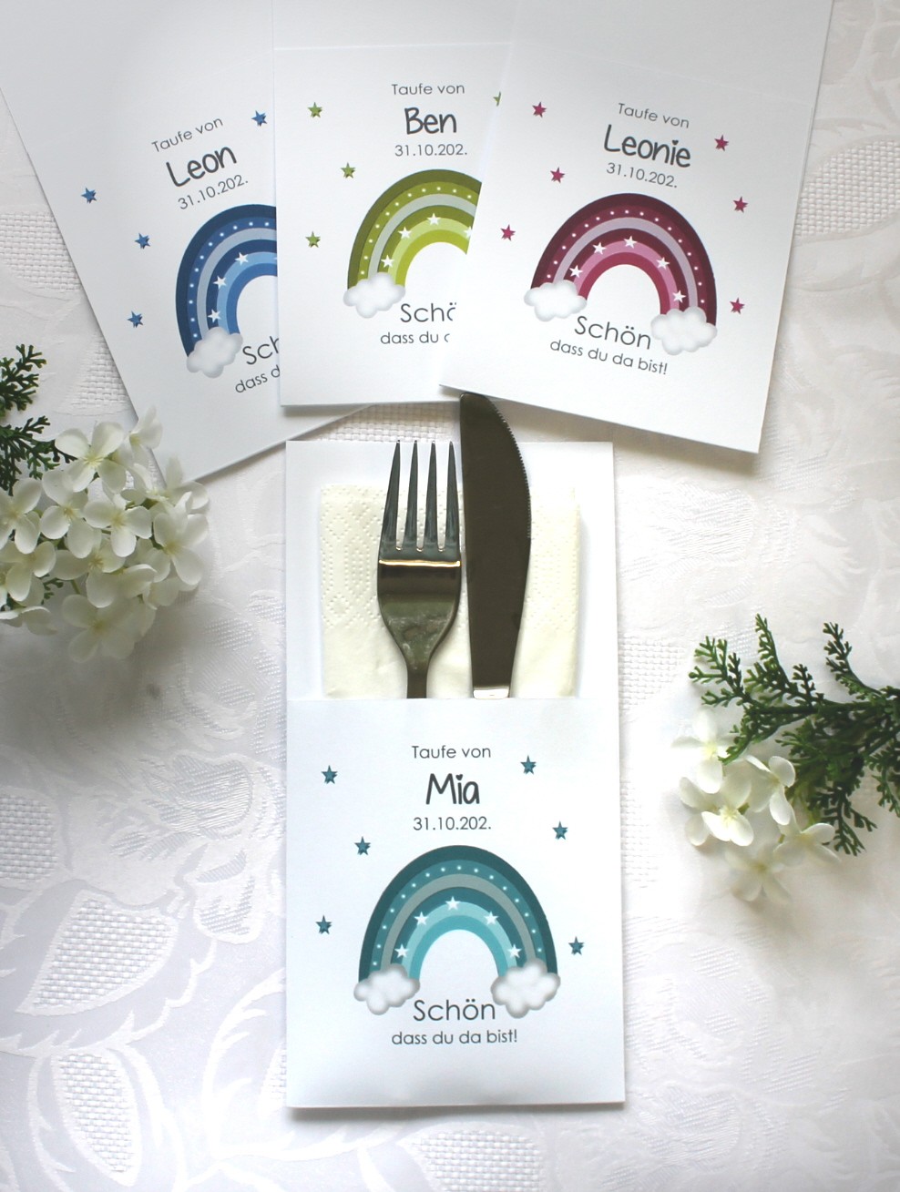 Unsere Bestecktaschen sind nicht nur ein elegantes Detail, sondern ein echter Blickfang auf jedem festlich gedeckten Tisch. Sie verbinden Stil und Funktionalität auf charmante Weise – ideal als Tischdekoration und zugleich als persönliches Highlight für Ihre Gäste. Jede Bestecktasche wird mit Liebe zum Detail gefertigt und kann perfekt mit dem Design Ihrer Gastgeschenk-Kerzen kombiniert werden. So entsteht ein harmonisches Gesamtbild auf Ihrer festlichen Tafel.