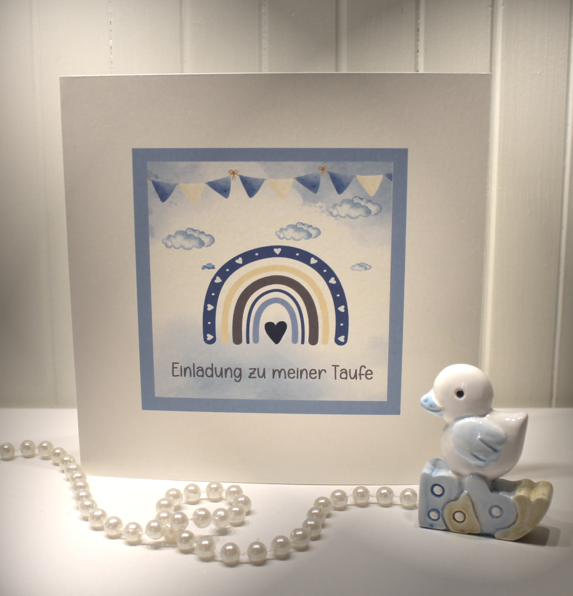 Schick und einzigartig zugleich. Einladungskarte für Ihre Taufe. Sie erhalten hier 10 Einladungskarten incl. Umschläge und Einlageblätter zu einem absoluten Top Preis. Design: Regenbogen blau Größe Karte - 13,5 x 13,5cm - Papierstäke: 220 g/m2 Größe Umschlag - 14,5 x 14,5cm weiss, ohne Seidenfutter - incl. Einlegeblatt 13,0 x 16,5cm weiss zum bedrucken am PC Die auf dem Foto dargestellte Dekoration sind im Preis nicht inbergiffen.