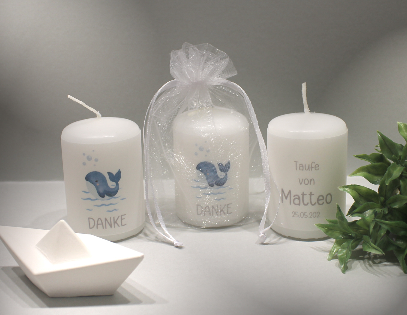 Gastgeschenk Kerze zur Taufe „kleiner Wal“ im Organzasäckchen, zum kleinen Preis! Design TA11